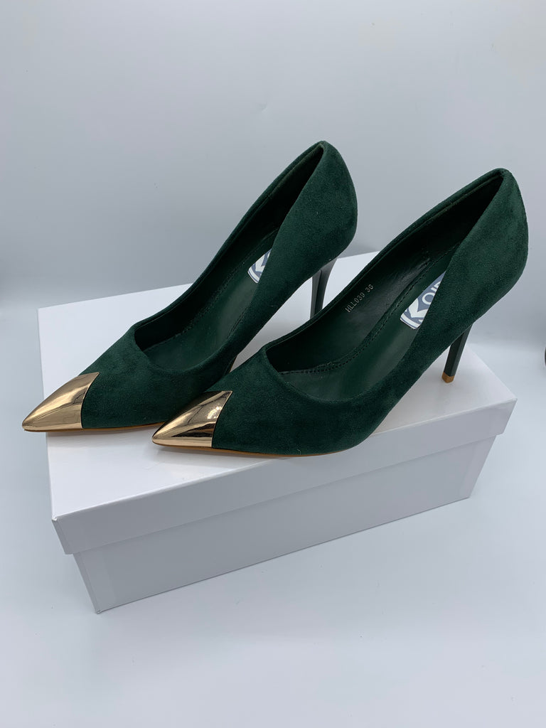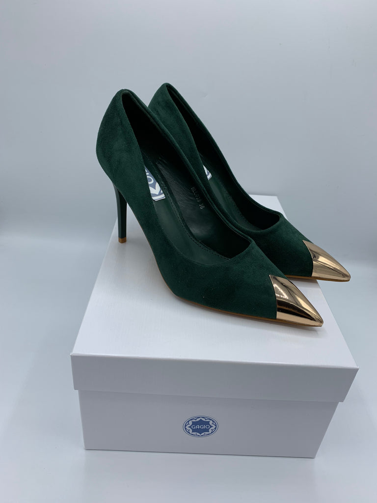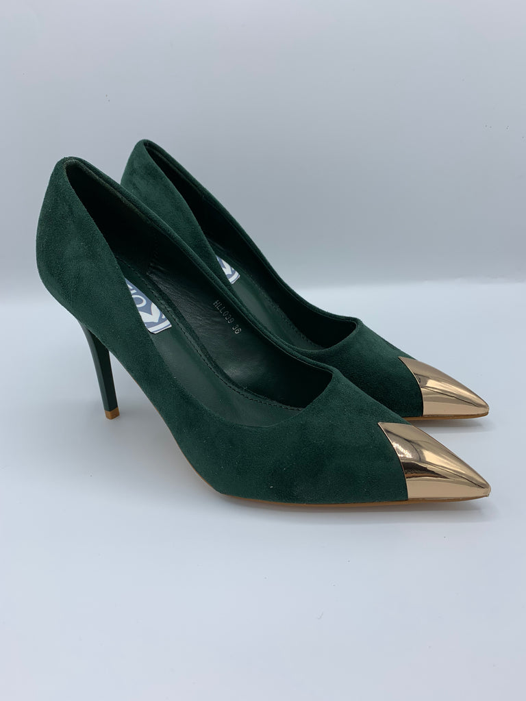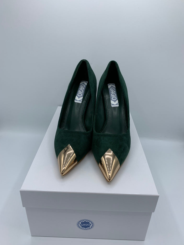 È in ecopelle scamosciata e ha la suola in thunit e possiede un dettaglio d’effetto con la sua punta metallizzata oro.